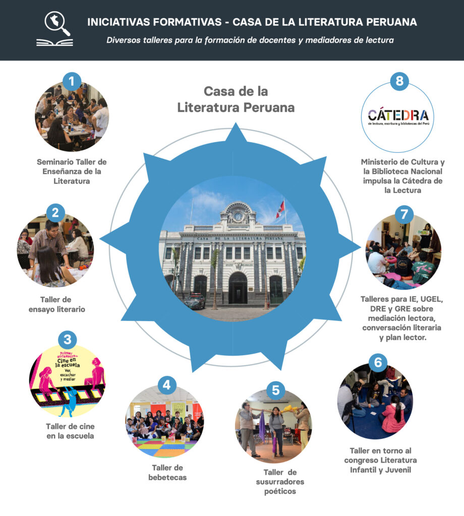 Adicionalmente, la Casa de la Literatura Peruana cuenta con diversas iniciativas que buscan contribuir a la formación y capacitación de docentes y mediadores de lectura. Entre ellas figuran: